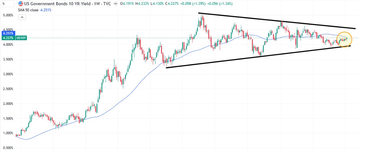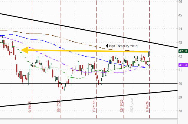 The 10yr #UST yield finally pushed out of its range since the start of December up +7bps to 4.23%, now up against the 200-DMA. A break through that likely targets that major downtrend line at 4.3%.