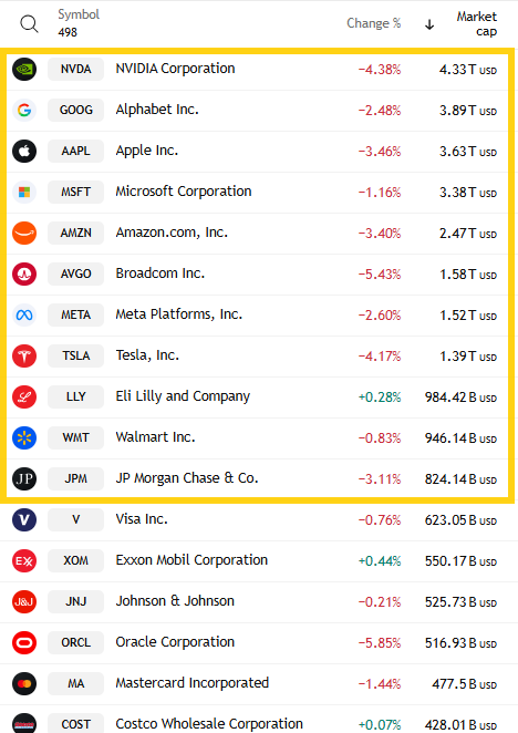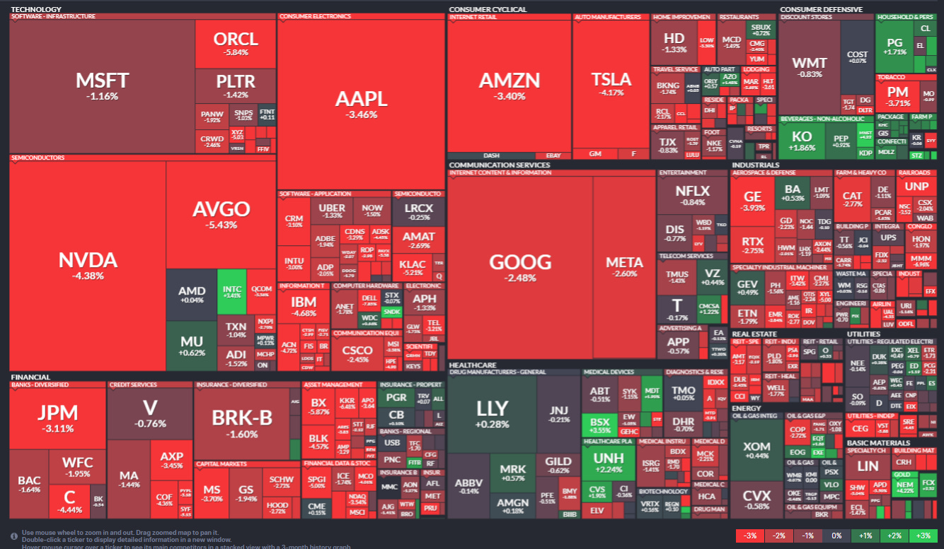 24 of the 125 down -3% or more were >$100bn in market cap (after 3 Fri/Thurs) and four >$1tn in market cap in KKR, BX, ORCL, AVGO, KLAC, SPGI, IBM, BLK, ADSK, C, YUM, NVDA, COF, TSLA, GE, PM, AAPL, AXP, AMZN, QCOM, LOW, JPM, CRM, INTU (in order of percentage losses).