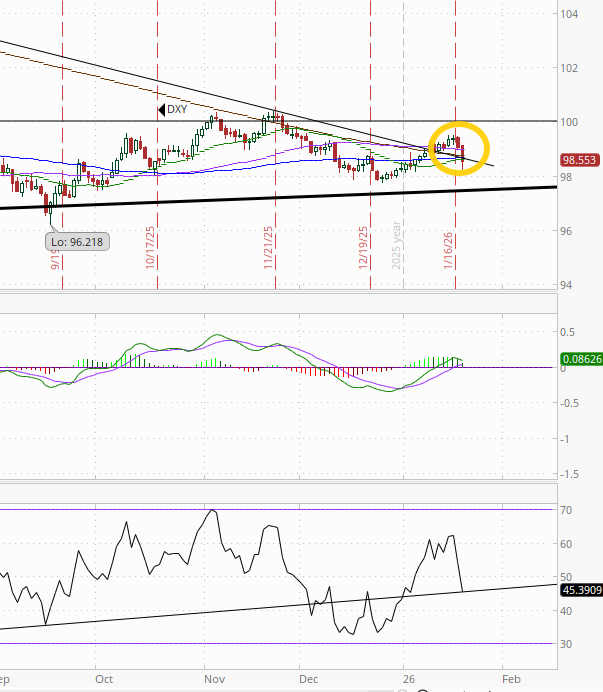 The daily MACD remains for now in “go long” positioning but the RSI fell back under 50 from over 60.