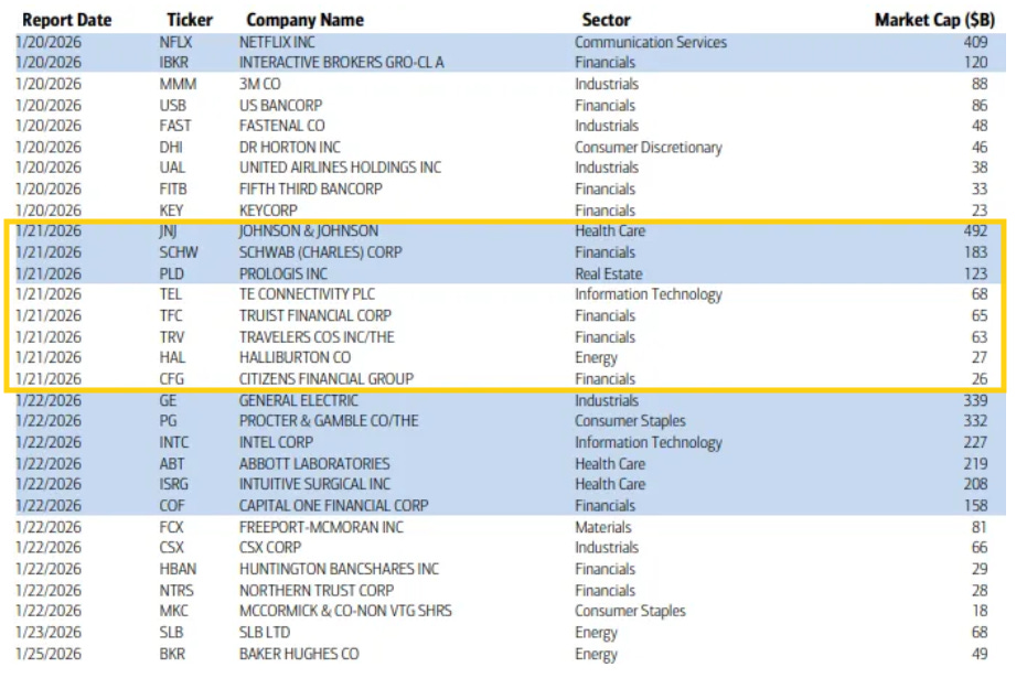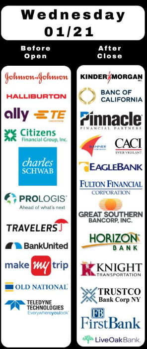 Q4 SPX earnings season continues to 8 SPX reporters, three of which are over $100bn in market cap in JNJ, SCHW, PLD (in descending order of market cap).