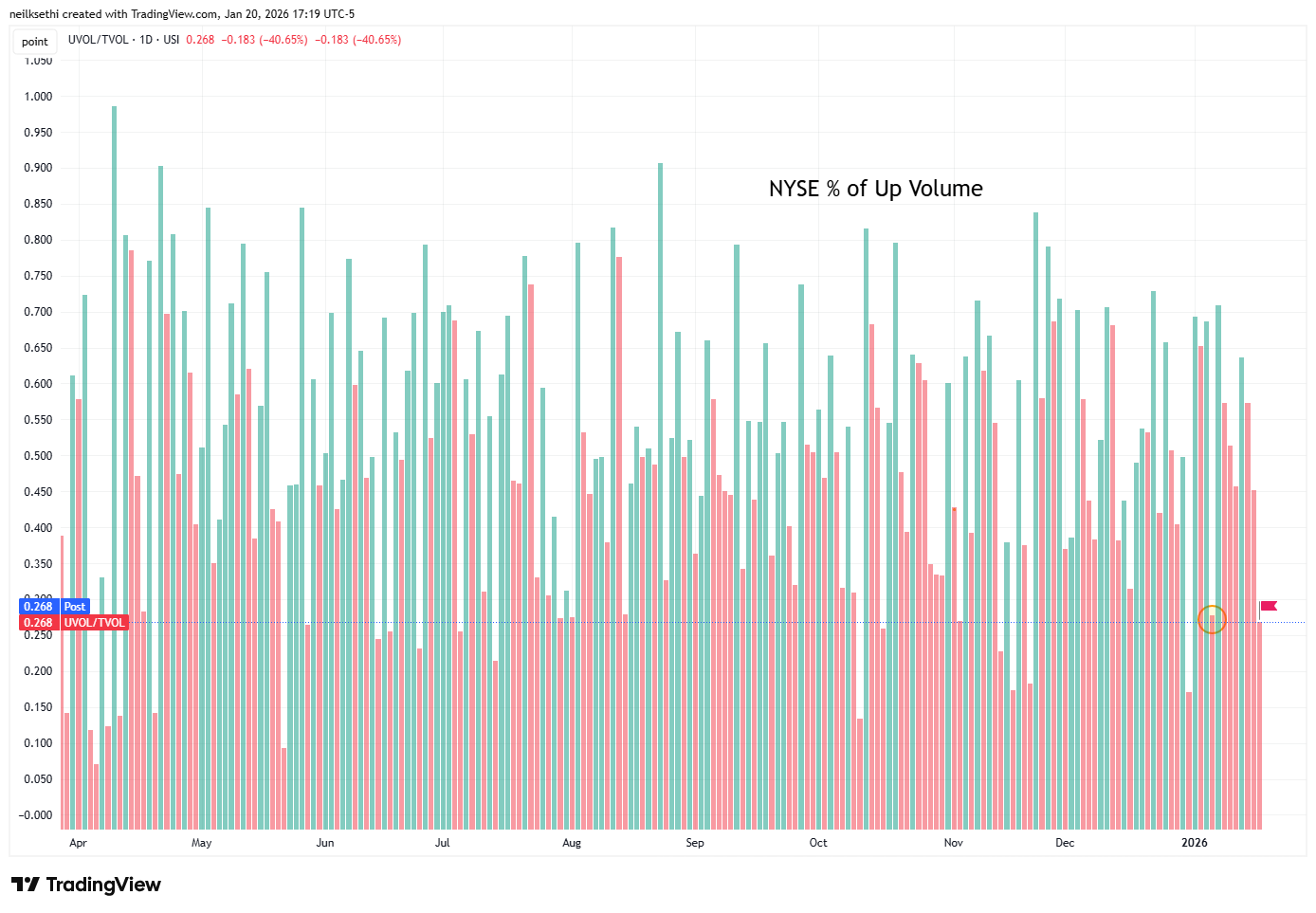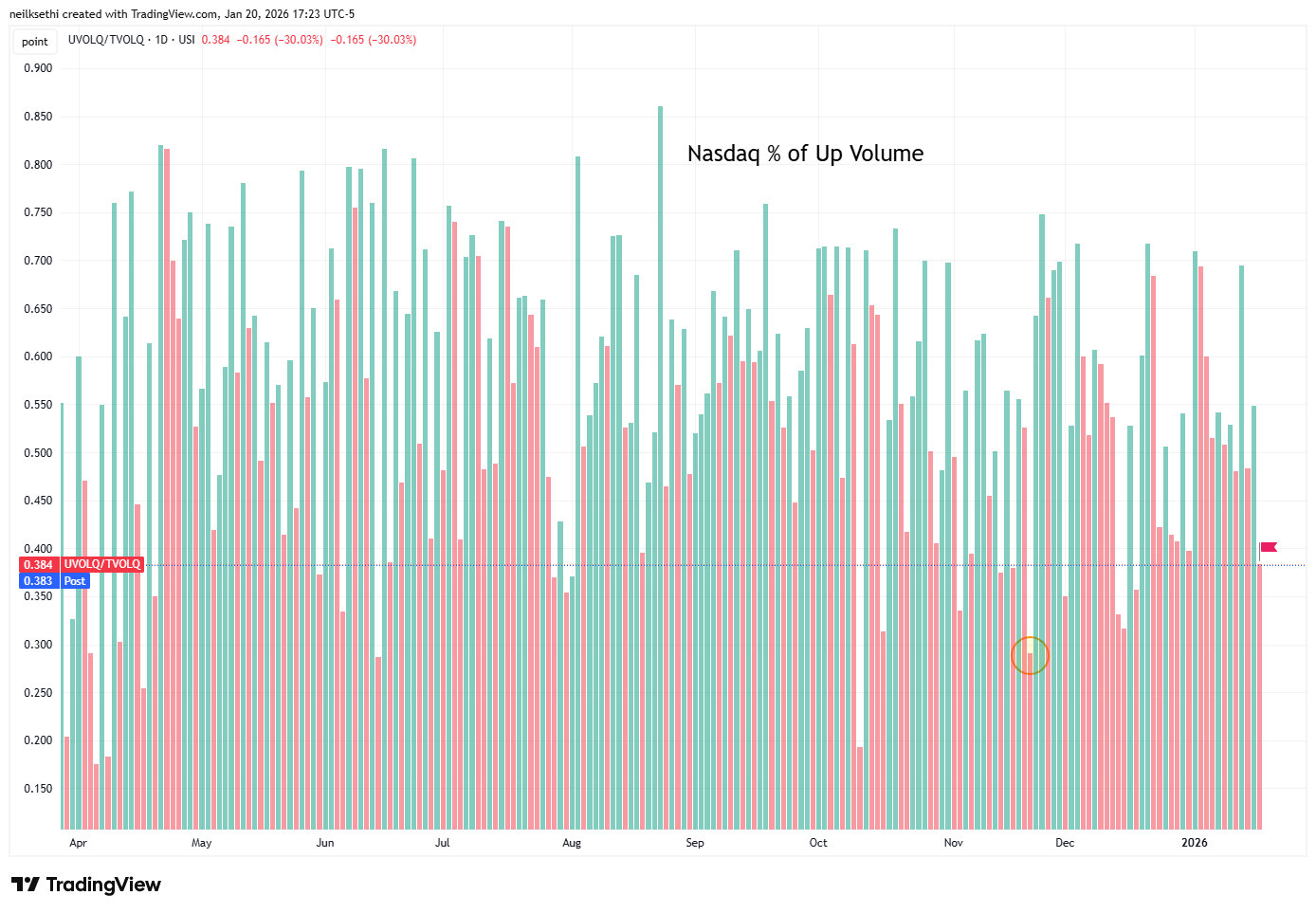 Nasdaq positive volume (% of total volume that was in advancing stocks) similarly fell to 38.4% outperforming the -2.39% loss in the index. Compare to Nov 20th when it was 29.8% with a -2.15% loss (circle).