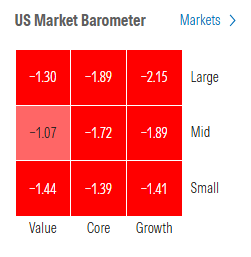 The market-cap weighted S&P 500 (SPX) was -2.1%, the equal weighted S&P 500 index (SPXEW) -1.5%, Nasdaq Composite -2.4% (and the top 100 Nasdaq stocks (NDX) -2.1%), the SOXX semiconductor index -1.7%, and the Russell 2000 (RUT) -1.2%.