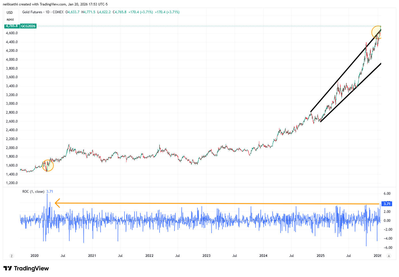 Gold futures (/GC) jumped higher, their best day since Apr 2020, and pushing above the top of the expanding wedge they’ve been in since late 2024. Daily MACD remains in “go long” positioning, while the RSI is over 70.
