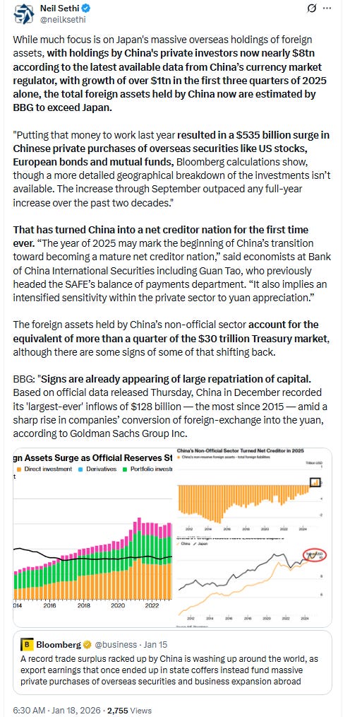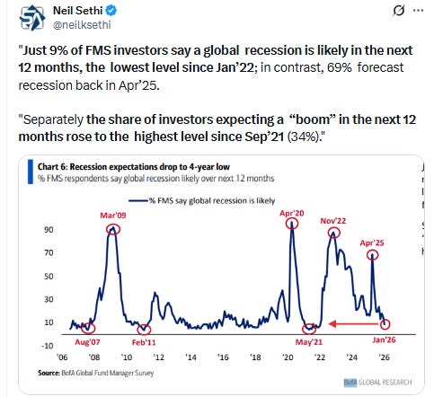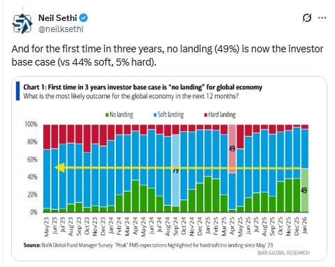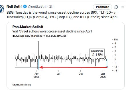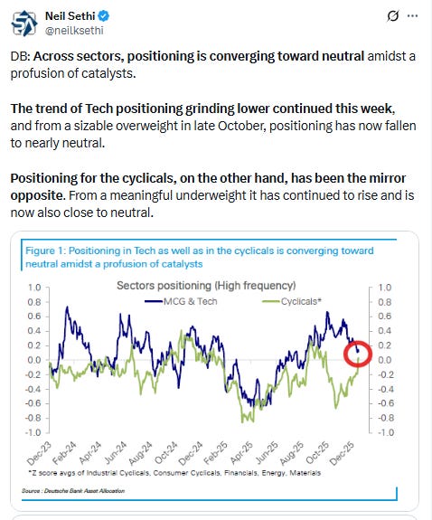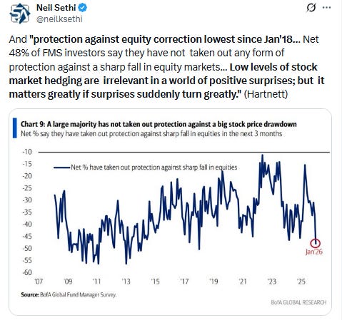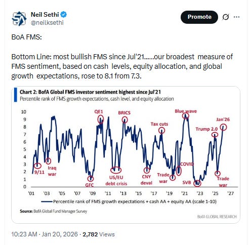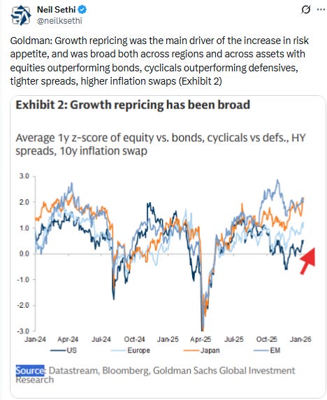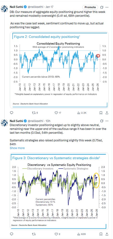 “Speculator positioning over the last few weeks has become net risk-on, leaving the market subject to upset if the latest geo-economic flare-up over Greenland escalates. The market is even less prepared for a risk-off move from this perspective than it was when Trump launched his tariff salvo last year, with the net measure back then significantly more in favor of risk-off instruments.” — Simon White, macro strategist