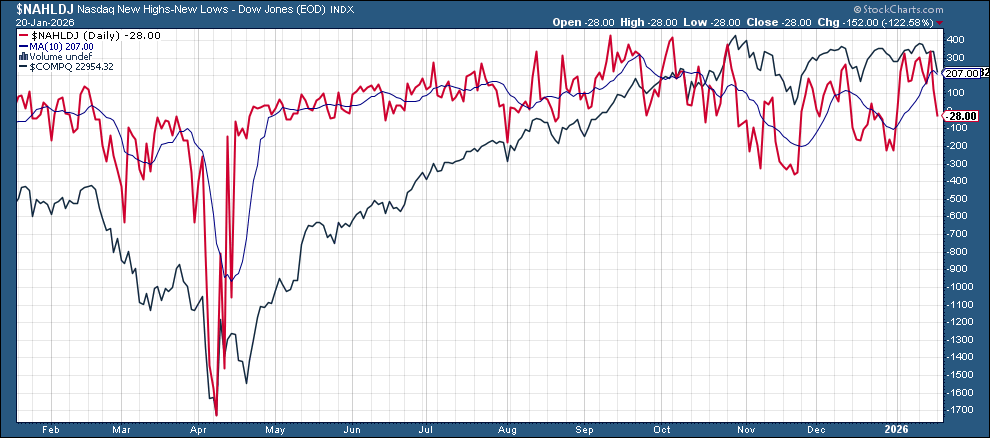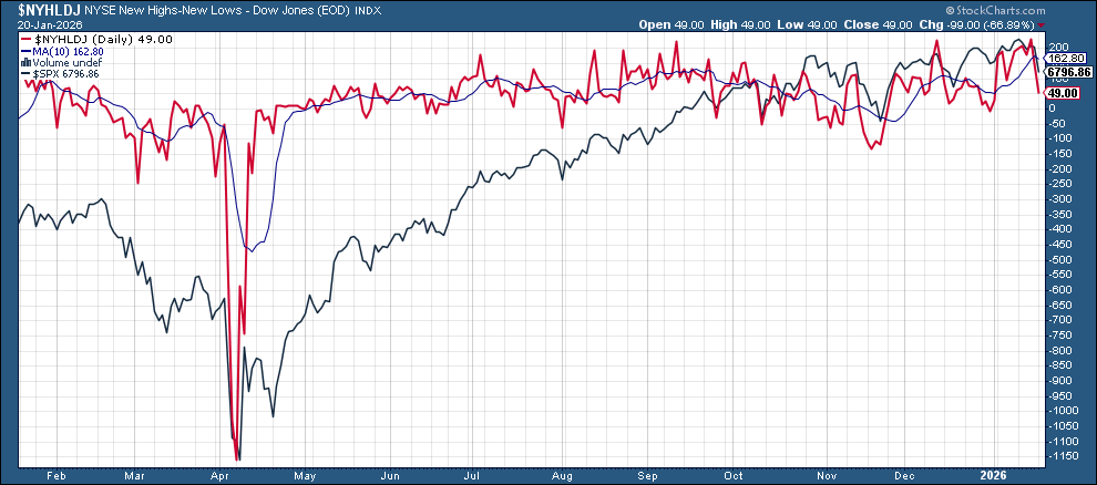 New 52-wk highs minus new 52-wk lows (red lines) fell back again now down to 49 on the NYSE from 227 Thurs, which was the best since Nov ‘24, while the Nasdaq fell to -32 from 335, the best since Oct.