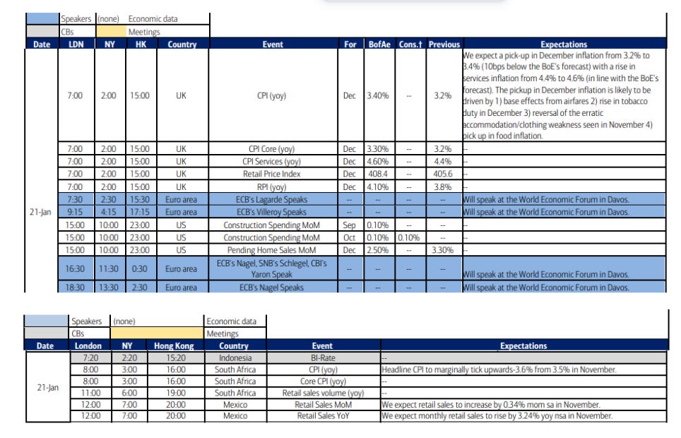 Finally, Pres Trump is making a keynote address in Davos overnight (scheduled for 2am ET) to be followed by a CNBC interview where he is expected to focus on his “America First” agenda and unveil proposals including around home affordability and credit card fees. He will likely also make additional comments, after having already created a stir over the weekend, regarding his desire for some sort of American ownership or control of Greenland (or perhaps walk it back a bit?).