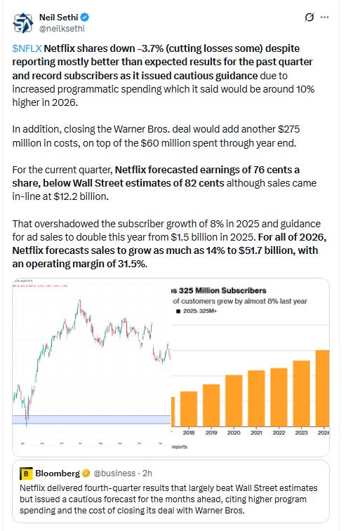 Netflix Inc. agreed to an amended all-cash deal to acquire Warner Bros. Discovery Inc.’s studio and streaming assets as it competes with Paramount Skydance Corp. for one of Hollywood’s most storied entertainment franchises. Netflix is scheduled to report earnings after the close Tuesday with investors being concerned about Netflix’s slowing flow of subscribers and the sustainability of its growth.