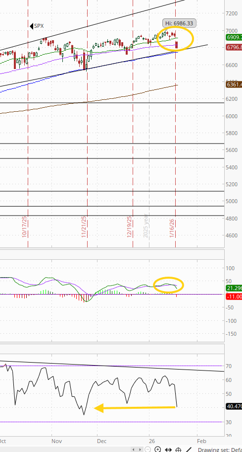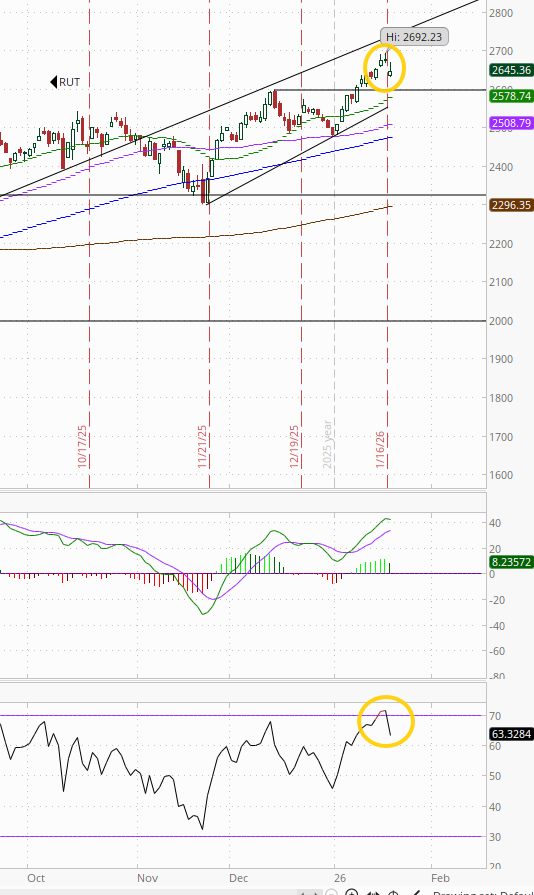 RUT (Russell 2000) remains the best chart of the bunch softening just a bit from its ATH. Its MACD remains with a “go long signal,” but the RSI did fall from over 70 to under.