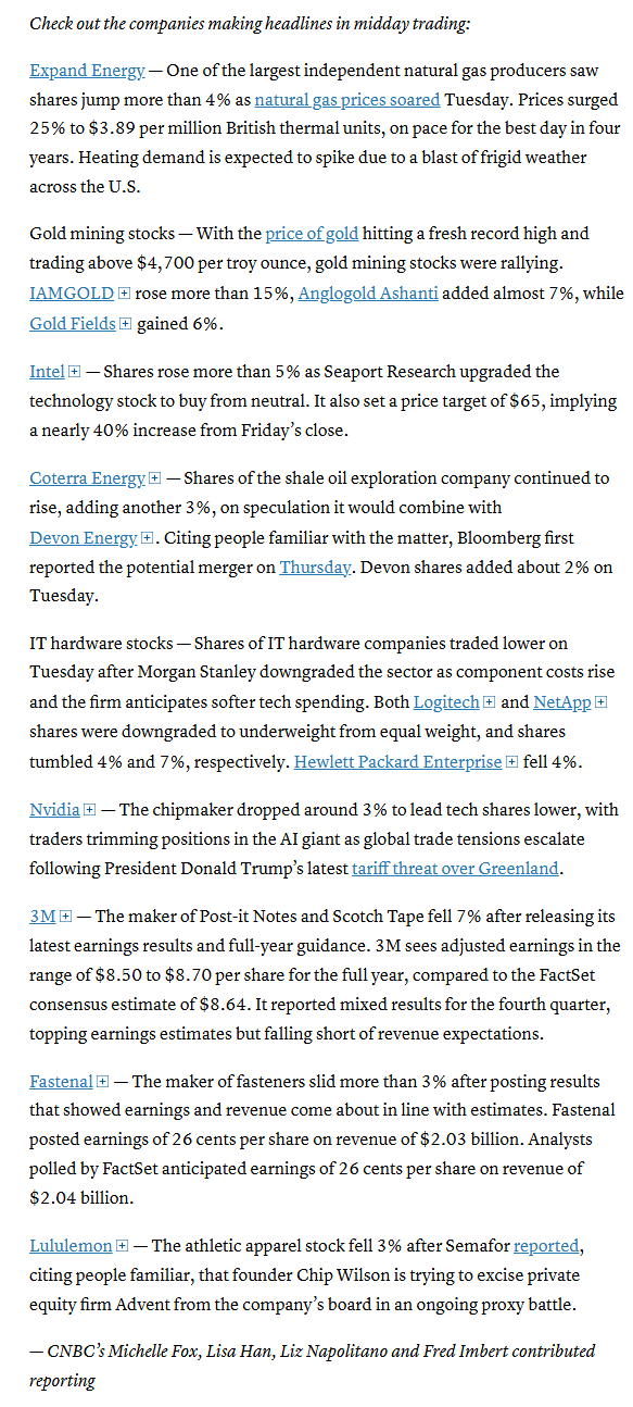 Brad Long, chief investment officer at Wealthspire, told CNBC that he isn’t surprised these latest developments are weighing on stocks, given that the market is “already priced for perfection” with “high” valuations and earnings expectations. “While tariffs is not new and Greenland, frankly — or the administration’s interest in Greenland — isn’t new, the weaponization of tariffs in the short term to achieve kind of a non-economic or maybe economic adjacent goal is new,” he said. “Europe walked out of 2025 largely unscathed, or at least unscathed on a relative basis for tariffs. Now, this is a direct line to some of the U.S.′ closest allies — eight nations across Europe, 10% to 25% tariffs. We’re kind of picking back up the 2025 April volatility of Trump uncertainty and shifts in policy.”