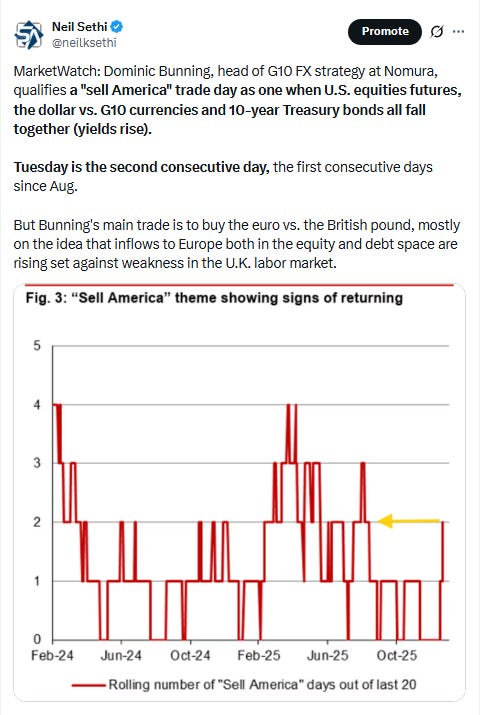 “While investors could remain worried about Liberation Day 2.0 selling from Europe over the US threat to take Greenland, European investors likely have limited options if they wish to rotate out of Treasuries,” said Gennadiy Goldberg at TD Securities. “However, in the near-term, attempts at diversifying can pressure Treasuries.”