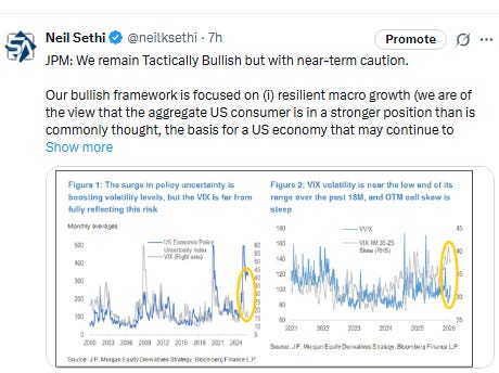 The current level is now consistent with “elevated” daily moves in the VIX over the next 30 days (historically normal is 80-100, but we’ve been above 90 almost the entire time since July ‘24)). 100 is also a level flagged by Charlie McElligott as one to watch.