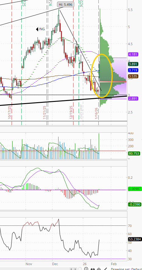 Natgas futures (/NG) surged 25%, and that was without the benefit of a contract roll, the largest gain I believe since Sept 2006 after a polar vortex was forecast which will drop temperatures sharply through the end of the month. I had said that “I do expect this area will offer better support” when it got to $3, but this obviously wasn’t what I had in mind.