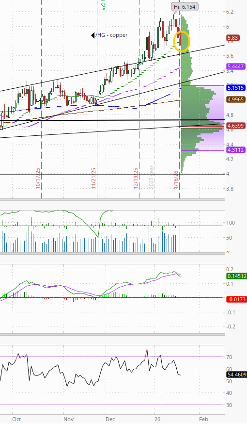 US copper futures (/HG) though lost a little ground for a third session still not far from all-time highs. But as noted Friday, “the daily MACD has crossed to ‘sell longs’ positioning while the RSI has fallen to the least since Nov, so we’ll see if a deeper pullback is in the cards.”