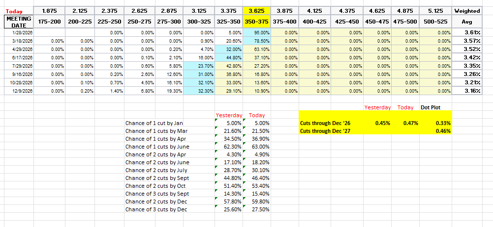 Pricing for 2026 edged up +2bps to 47bps (as noted Thurs under two cuts for the first time), with pricing for two cuts 60% and three cuts 28% (down from 68bps Dec 3rd (and 80bps mid-Nov which was highest we’d been for 2026 cuts)).