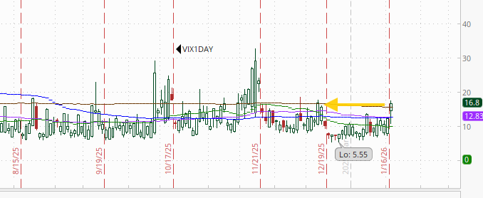 The 1-Day VIX jumped to the level prior to the Dec FOMC at 16.8. The current reading implies a ~1.08% move in the SPX next session.
