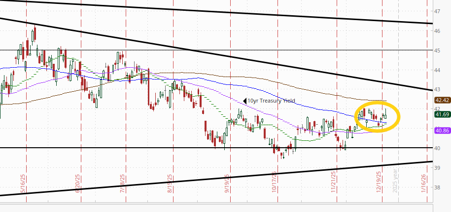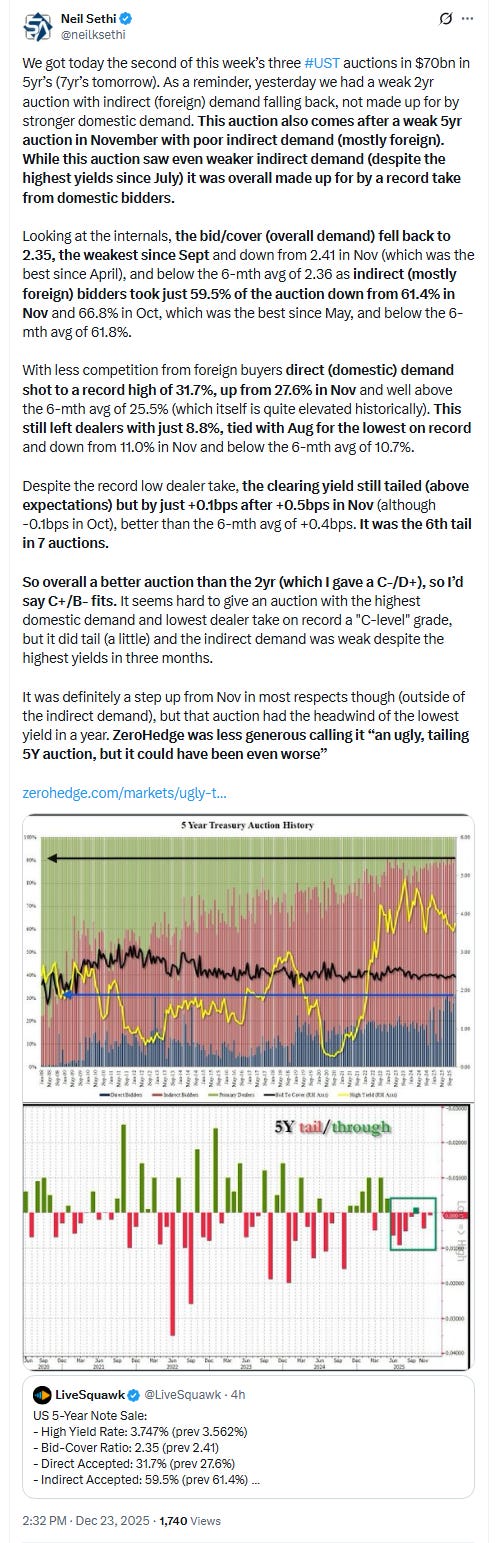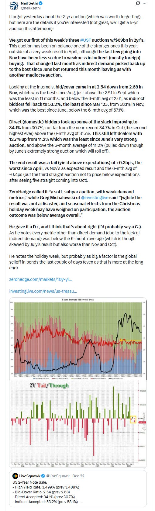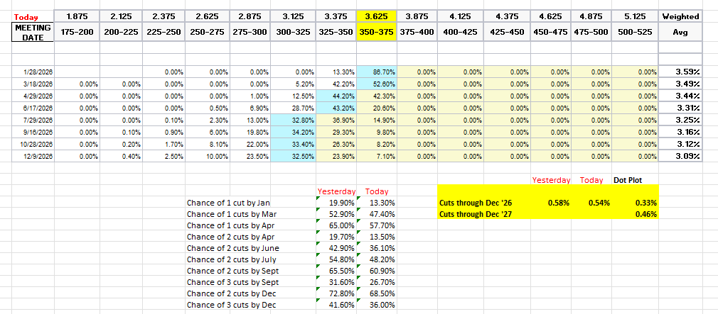 Pricing for 2026 overall moved -4bps to 54bps, with pricing for two cuts 69% and three cuts 36% (down from 68bps Dec 3rd (and 80bps mid-Nov which was highest we’d been for 2026 cuts)).