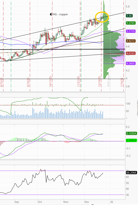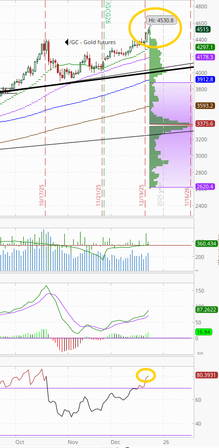 The unstoppable run of gold futures (/GC) continues now through $4500 . Daily MACD as noted last week remains in “go long” positioning, but the RSI is now at 80 so starting to get extended (but not yet as extended as in Oct)