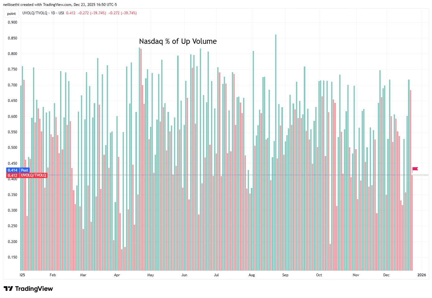 Positive issues (percent of stocks trading higher for the day) which are not as inflated by penny/meme stocks a bit lower on both exchanges with the Nasdaq at 38% while the NYSE was 40%.