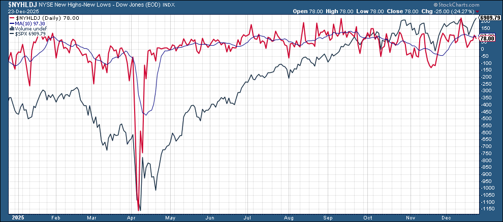 New 52-wk highs minus new 52-wk lows (red lines) also fell back despite the positive index gains to 78 from 104 on the NYSE, and -49 from 34 on the Nasdaq.