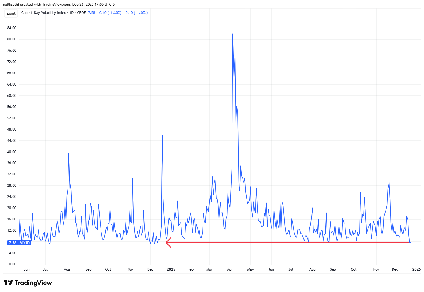 Like the VIX the 1-Day VIX edged to a new lowest close for the year at 7.6. The current reading implies a ~0.47% move in the SPX next session.