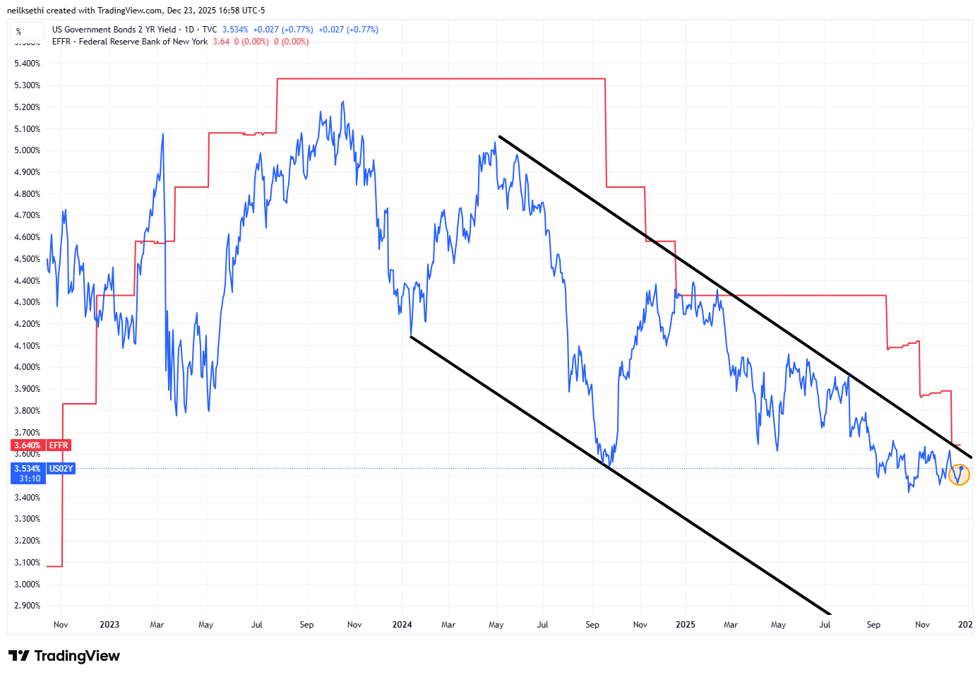 This seems like a fairly rich yield at these levels unless we really aren’t going to get any more rate cuts (then it’s a bit expensive (i.e., yield should be higher)). That said I just don’t know that I want to buy 2-years at what is basically the 1-month yield.