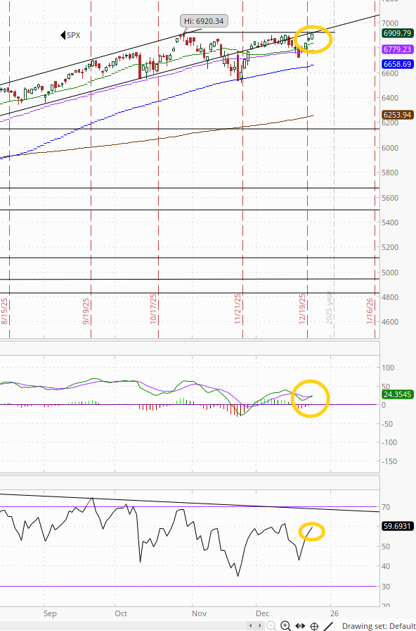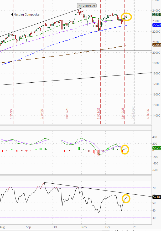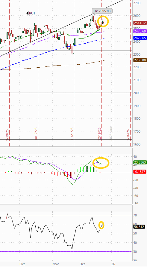 RUT (Russell 2000) went from the best to the worst technical picture of the three, but it’s still above both its 20 and 50-DMAs and not far from its ATH. As noted Thurs we did get a daily MACD crossover to “sell longs” but very mild for now. RSI remains over 50.