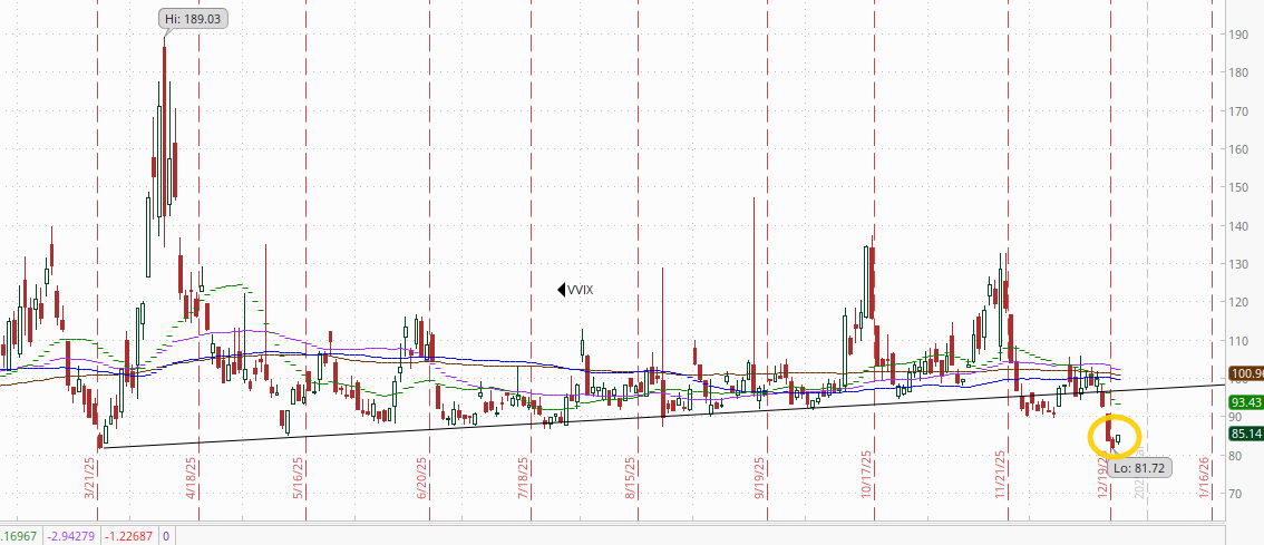 The VVIX (VIX of the VIX) though got a small bounce to 85.1 after Mon touching the lowest levels since July ‘24 (before the carry trade blow-up). The current level remains consistent with “moderate” daily moves in the VIX over the next 30 days (historically normal is 80-100, but we’ve been above 90 almost the entire time since July ‘24)).