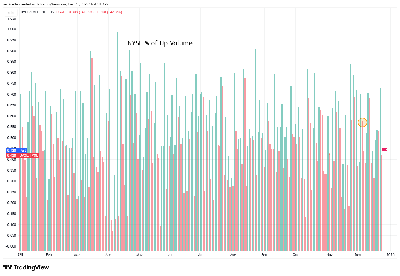 NYSE positive volume (percent of total volume that was in advancing stocks (these also use futures)) after seeing a big improvement Mon was back to weak at just 42.0% Tues despite an index gain of +0.18%.