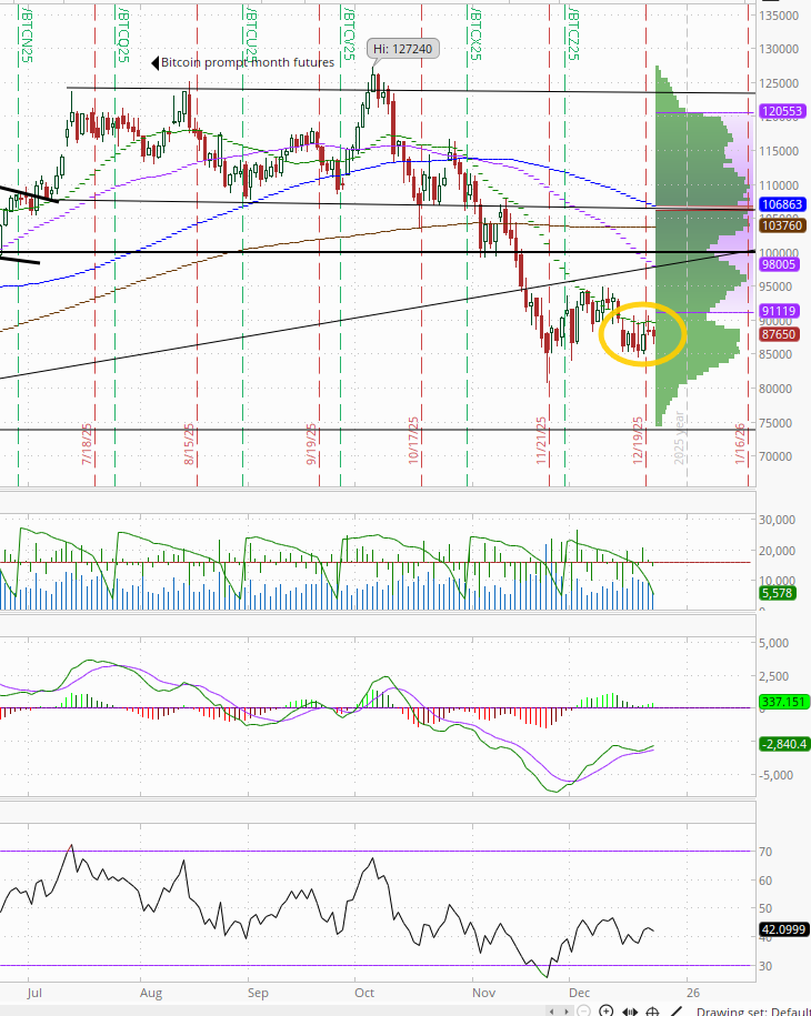 Bitcoin futures remain trapped between the $85k level on the downside and $90k resistance. The daily MACD remains “go long” positioning, but the RSI is still under 50.