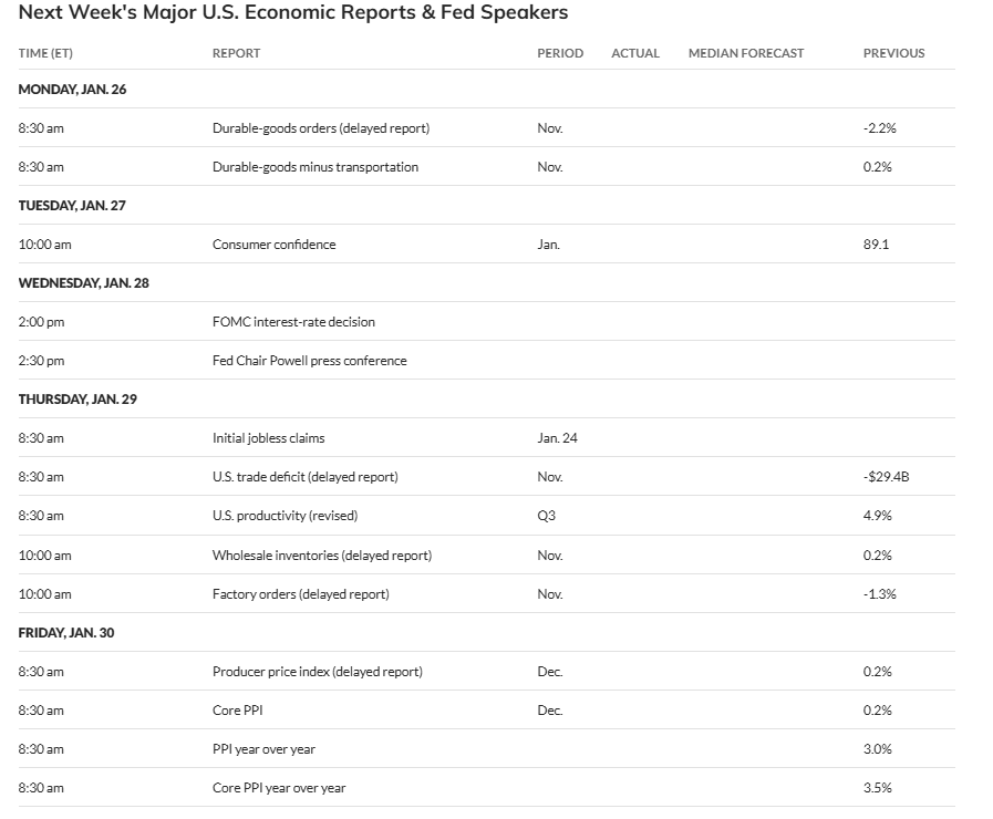 US economic data relatively light next week with mostly just a bunch of delayed reports in Dec PPI, Nov durable goods, factory orders, trade balance, and wholesale inventories along with the Conference Board Jan consumer confidence report and the normal weekly reports (ADP, jobless claims, mortgage applications, petroleum inventories).