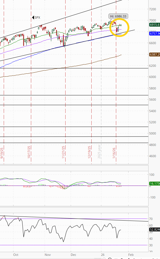 As noted Wed, “the daily MACD has crossed to ‘sell longs’ positioning and the RSI is under 50.” Test of the uptrend line coming?