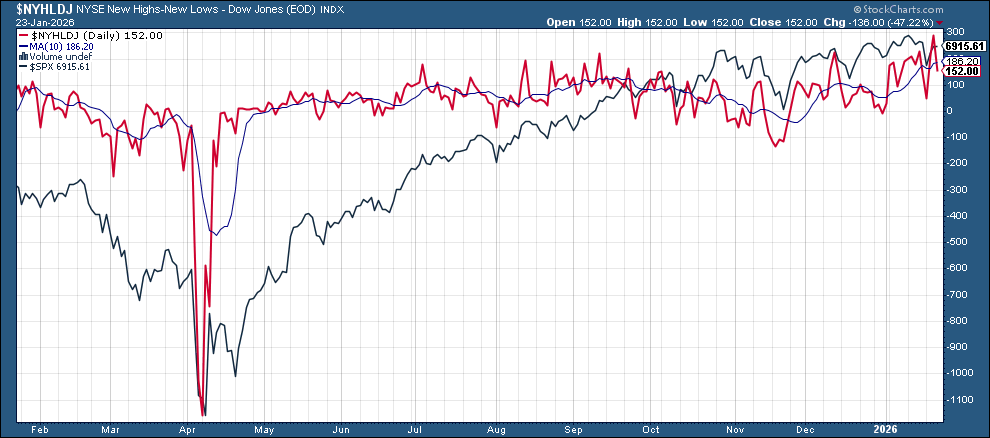 New 52-wk highs minus new 52-wk lows (red lines) fell back from the best levels since Nov ‘24 at 152 (from 288) on the NYSE, and 176 (from 490) on the Nasdaq.