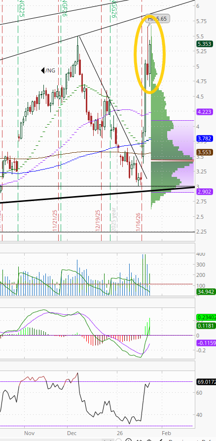I asked Wed whether natgas futures (/NG) might “take a stab at the $5.50 highs from 2025,” and they did just that Thurs, jumping over +10% after their best two-day gain on record to a new 3-year intraday high before reversing sharply to finish lower on the day. I said it “sounds a lot like a potential ‘blow off top’”