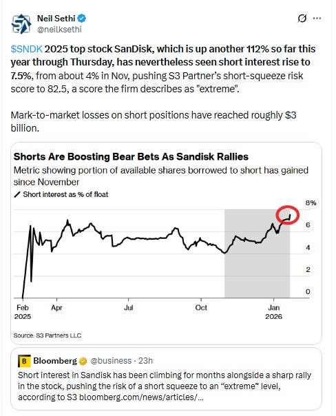 Short interest in Sandisk Corp. has been climbing for months alongside a sharp rally in the stock, pushing the risk of a short squeeze to an “extreme” level, according to S3 Partners LLC.