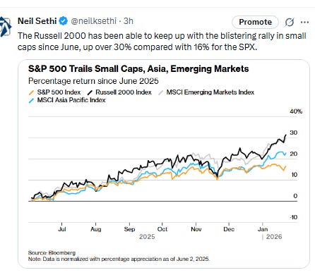 “Despite signs of stabilization in the labor market and broader economic improvement, growth remains fragile. The burden now sits with small caps to show that the swift rally is justified by earnings that can carry the index to new highs which keep performance ahead of the AI-fueled S&P 500.”