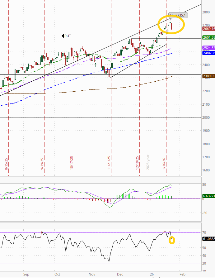 RUT (Russell 2000) remains the best chart of the bunch but a little less so after its worst day since Nov falling back from ATH territory. I’m not sure if that old trendline means anything but the last rally stopped there, so I’m going to leave it for now.