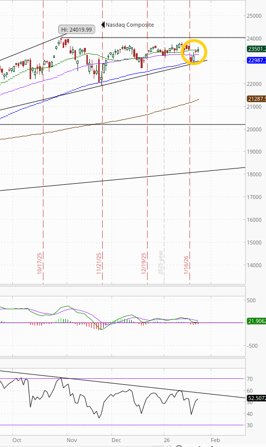 The MACD remains with a “go long signal,” but the RSI fell back to the least in a couple of weeks (I mentioned yesterday it had gotten to “levels that have seen the index stall out in the past year”).