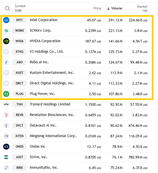 Also for the second time in three days, two of the top three stocks by volume were large market caps (today INTC and NVDA).