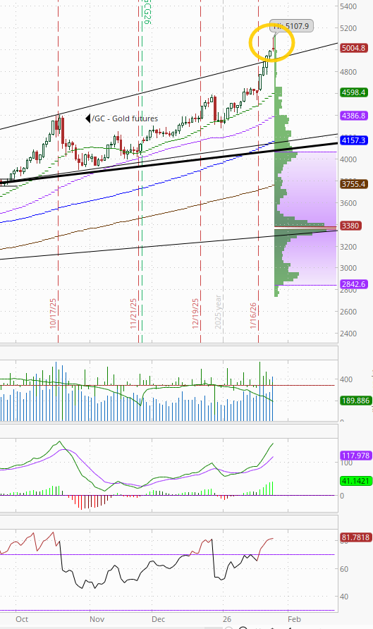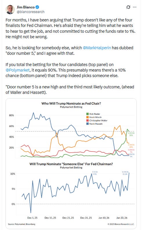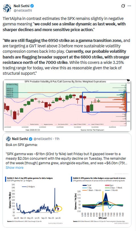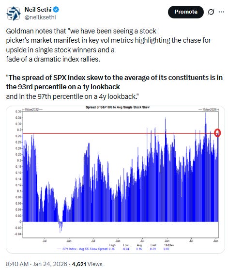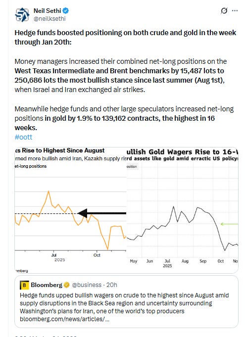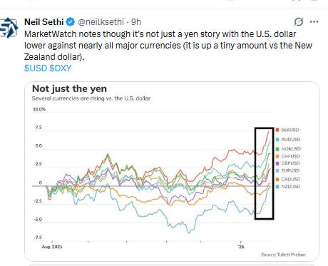 Elsewhere, bond yields edged lower, but the dollar fell more abruptly, completing its worst three-day loss since April falling to the lowest since Sept. Natgas though jumped another +20% (at least the increasingly less liquid Feb contract which expires Wed (more below)), while gold closed above $5,000 for the first time. Copper, crude, and bitcoin though all were lower with the last closing at the lowest this year.