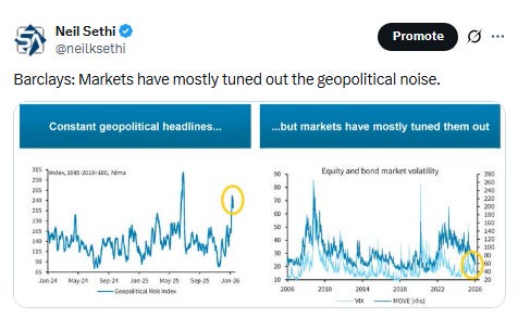 “Markets appear increasingly desensitized to breaches of international laws — whether in Venezuela, Iran, or Greenland,” said Antoine Bracq, head of advisory at Lighthouse Canton. “A similar indifference has prevailed in response to military exercises around Taiwan and the ongoing invasion of Ukraine.”
