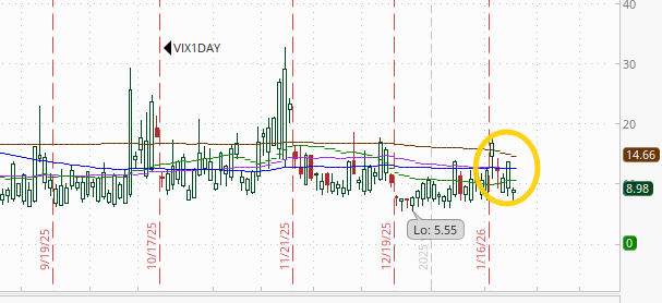 With the weekend behind us and no major catalysts Tuesday, the 1-Day VIX fell back to 9.0. That reading implies a ~0.56% move in the SPX next session.