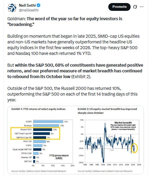 “Based on what we’ve seen so far, the overall picture remains the same. We anticipate earnings growth accelerating to 14%, and thus we reiterate our recommendations from December: energy, basic materials, Magnificent Seven, Bitcoin, and Ethereum,” wrote Tom Lee, head of research at Fundstrat.