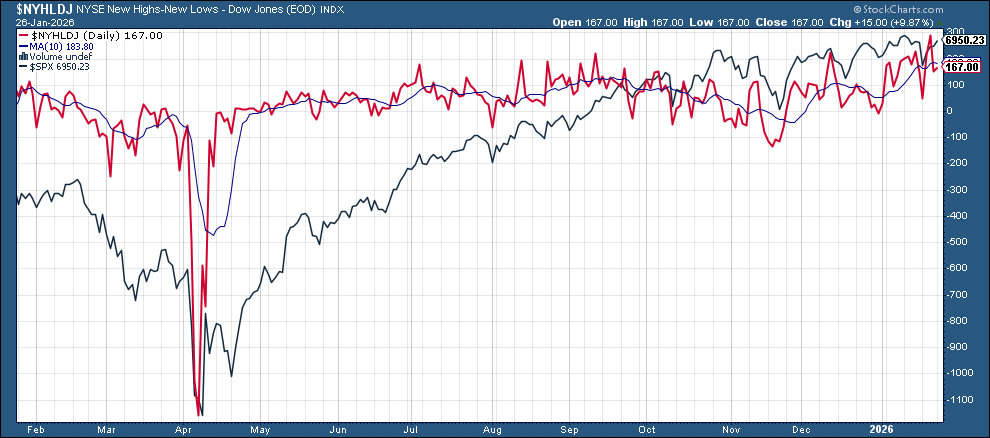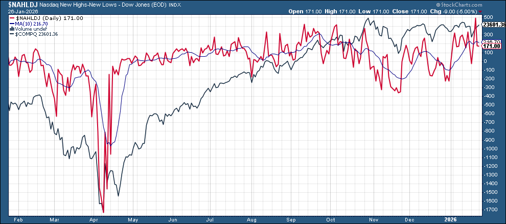 New 52-wk highs minus new 52-wk lows (red lines) were little changed at 167 on the NYSE (still down from 288 Thurs, the best since Nov ‘24 ), and 171 on the Nasdaq (down from 490 Thurs, also the best since Nov ‘24).
