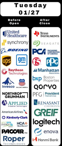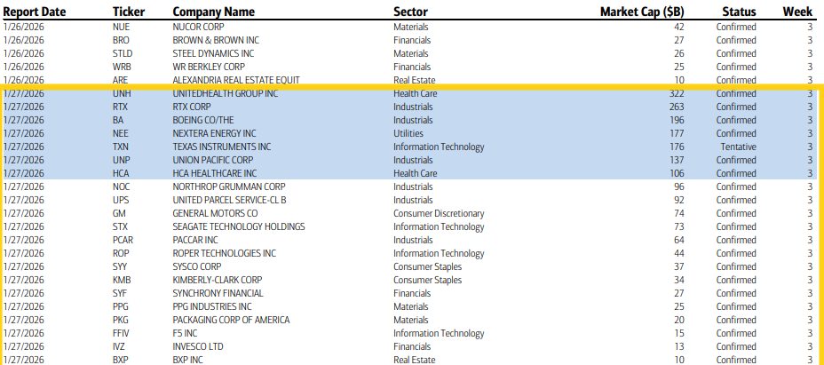SPX earnings pick up with ~25 SPX components reporting. No Mag-7 yet, but seven are >$100bn in market cap in UNH, RTX, BA, NEE, TXN, UNP, HCA (in descending order by market cap).