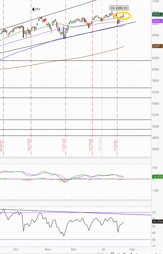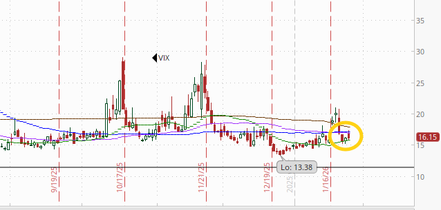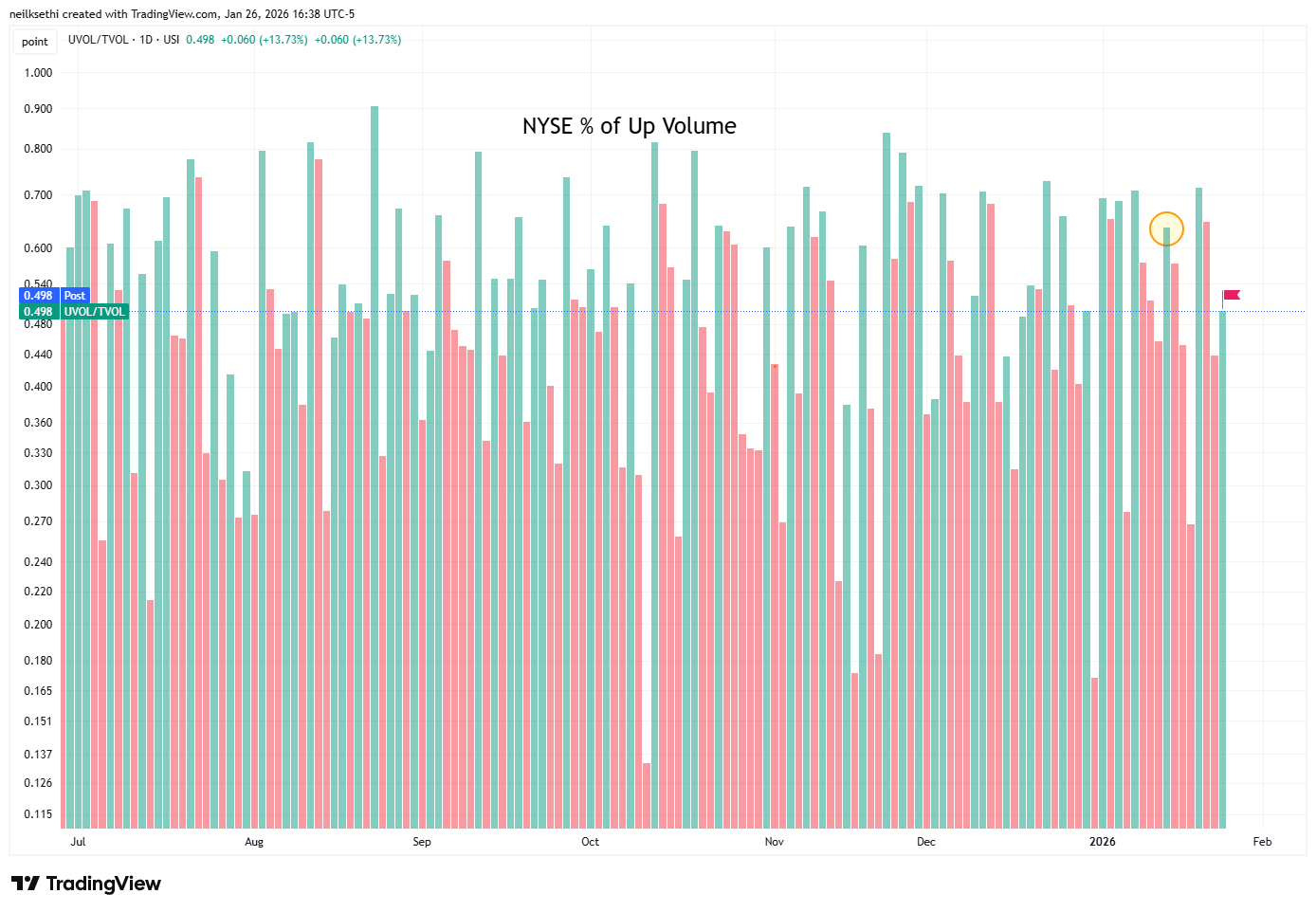 NYSE positive volume (percent of total volume that was in advancing stocks (these also use futures)) improved to 49.8% but that’s pretty weak given the +0.32% gain in the index. Compare to Jan 14th when it was an excellent 63.6% on a +0.29% gain (circle).
