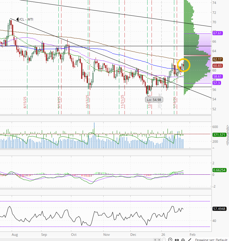 WTI futures took a stab higher after finishing Fri at the highest close since Oct 27th but fell back. Daily MACD remains in “go long” positioning while the RSI is now close to 60. As I mentioned Friday, “still lots of resistance overhead.”