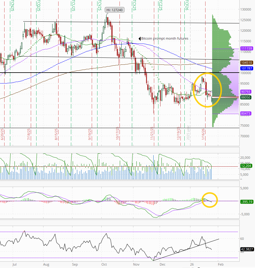 Bitcoin futures fell to the lows of the year as they continue to sit out the party. I noted Wed “has a good deal of resistance above.” The daily MACD as mentioned Tues flipped to “sell longs” positioning, and is now “go short,” while the RSI approaches 40.