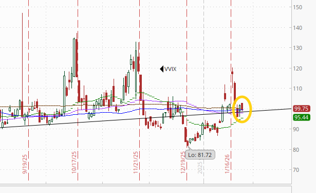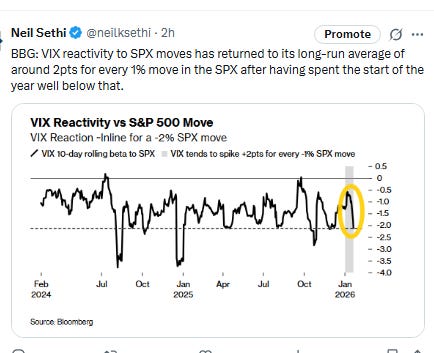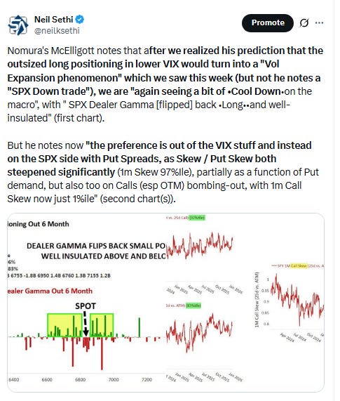 The VVIX (VIX of the VIX) edged lower to 99.8. The current level is consistent with “moderate” daily moves in the VIX over the next 30 days (historically normal is 80-100, but we’ve been above 90 almost the entire time since July ‘24)). 100 is the level flagged by Charlie McElligott as one to watch.