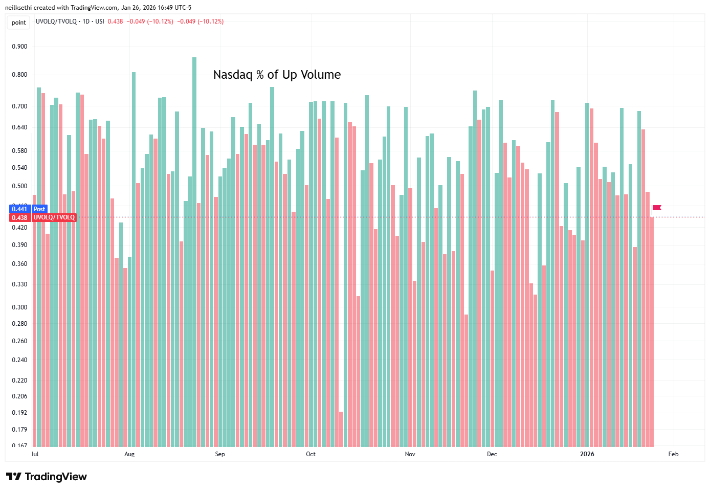 Positive issues (percent of stocks trading higher for the day), which are not inflated by high speculative volumes, were similar to positive volume at 47% on on the Nasdaq, 49% on the NYSE.