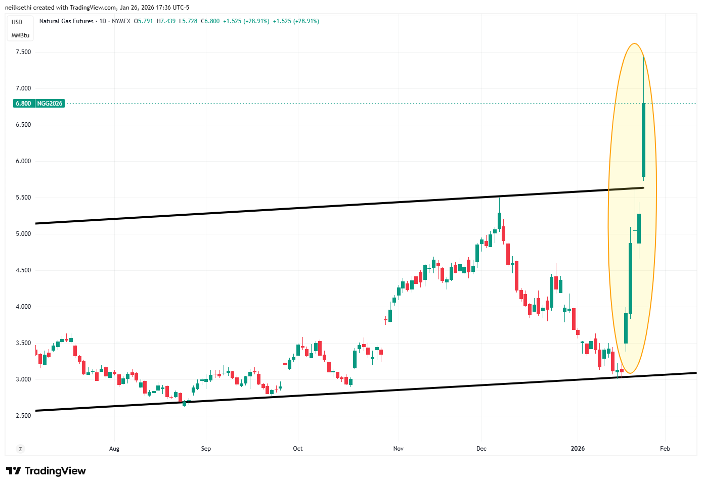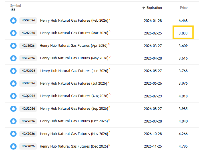Natural gas has entered “ludicrous mode” with futures (/NG) jumping over $2 during the session (~40%) before cutting that in half still taking the gains over the past five sessions well over 100%. To a (very) large extent though this is a function of the Feb contract not yet rolling but being within a couple of days of expiration (Wed) meaning liquidity is increasingly thin.